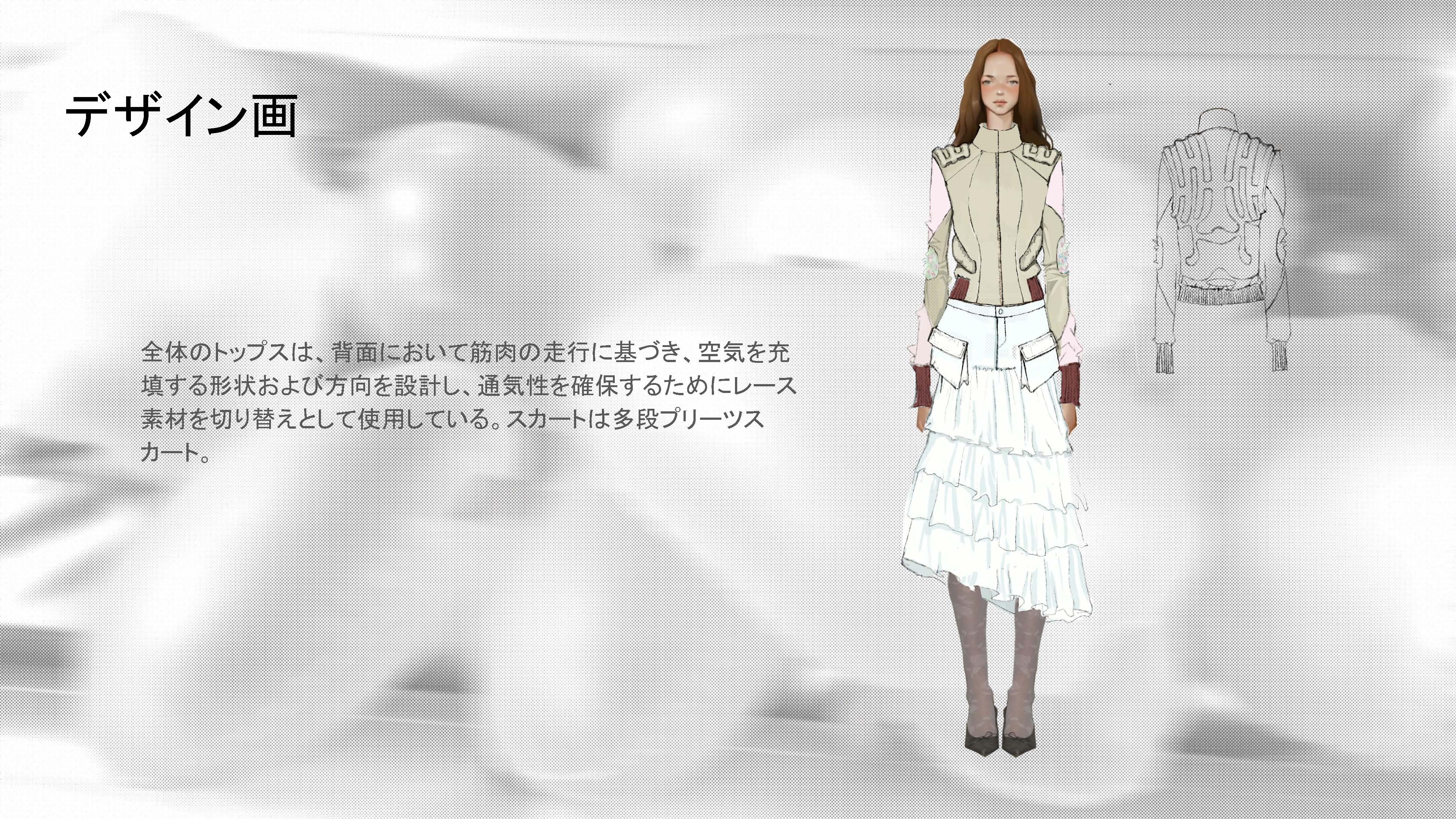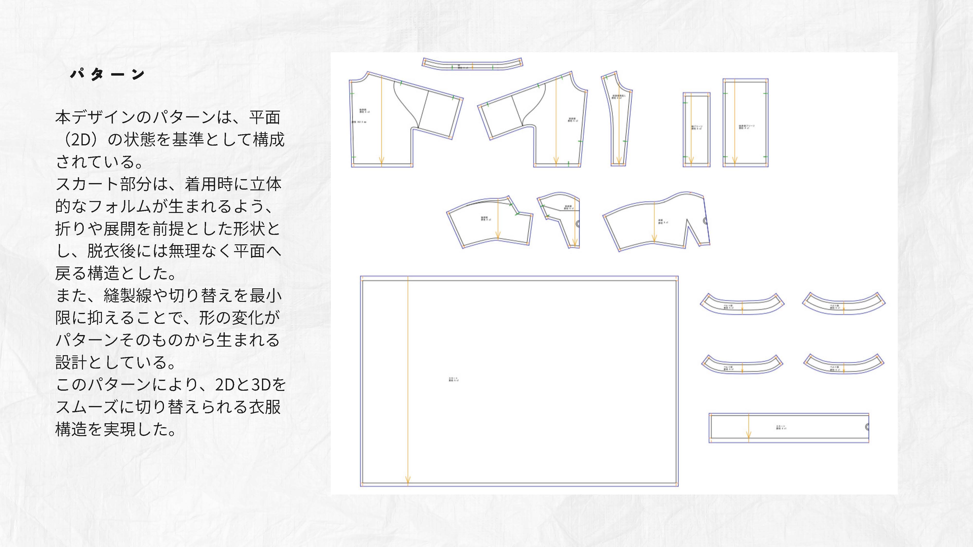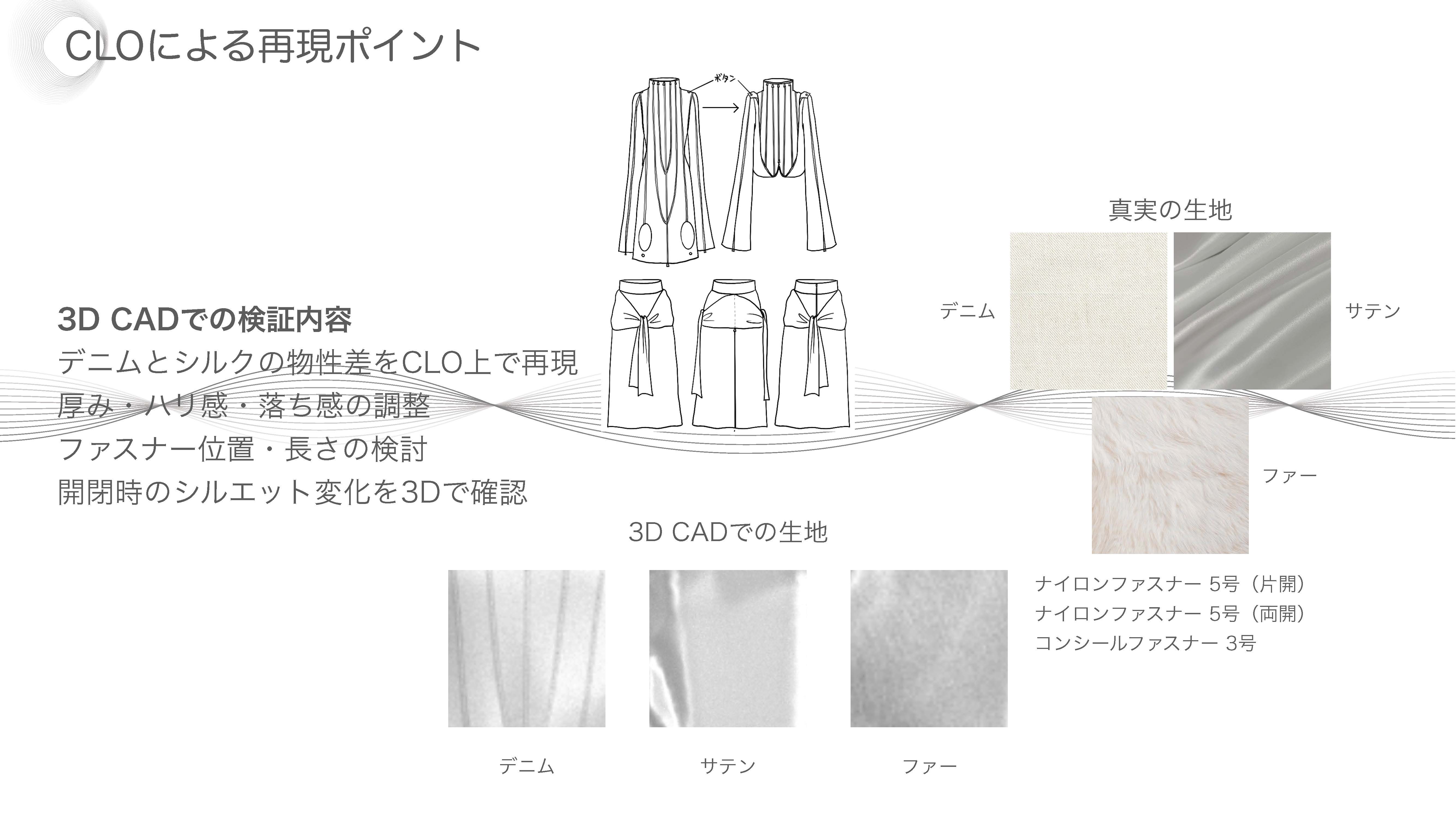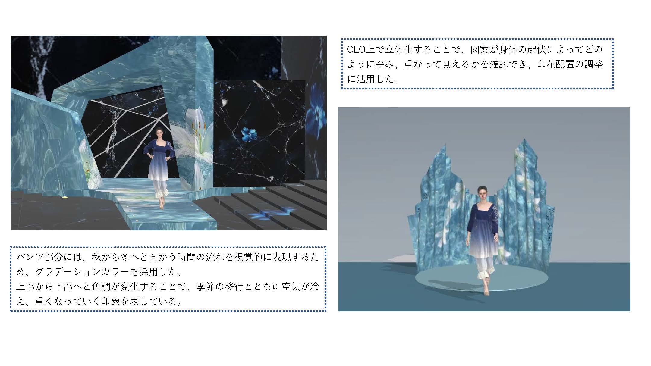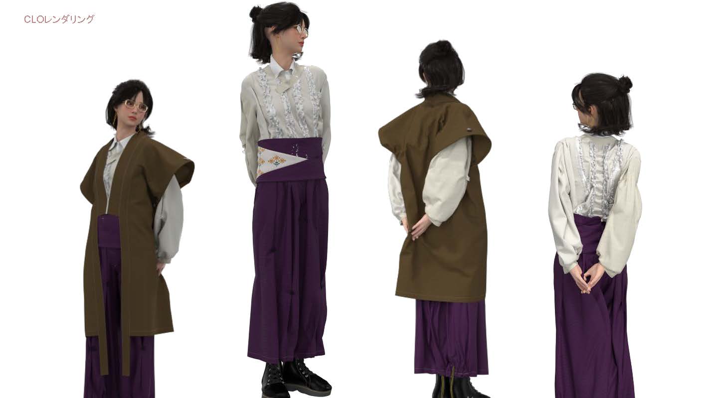 院生の研究や作品制作に アパレル3DCAD「CLO Enterprise」を活用する取り組みを積極的に行っています。 2020年度より、CLO Enterpriseの基礎オペレーションを学ぶ「アパレル3DCADⅠ」と、応用オペレーションを学ぶ「アパレル3DCADⅡ」を開講し、アパレル企業へ3Dデザイナー、3Dモデリストを輩出しております。ファッションクリエイション専攻の受講生の中より選抜された院生の作品を紹介いたします。