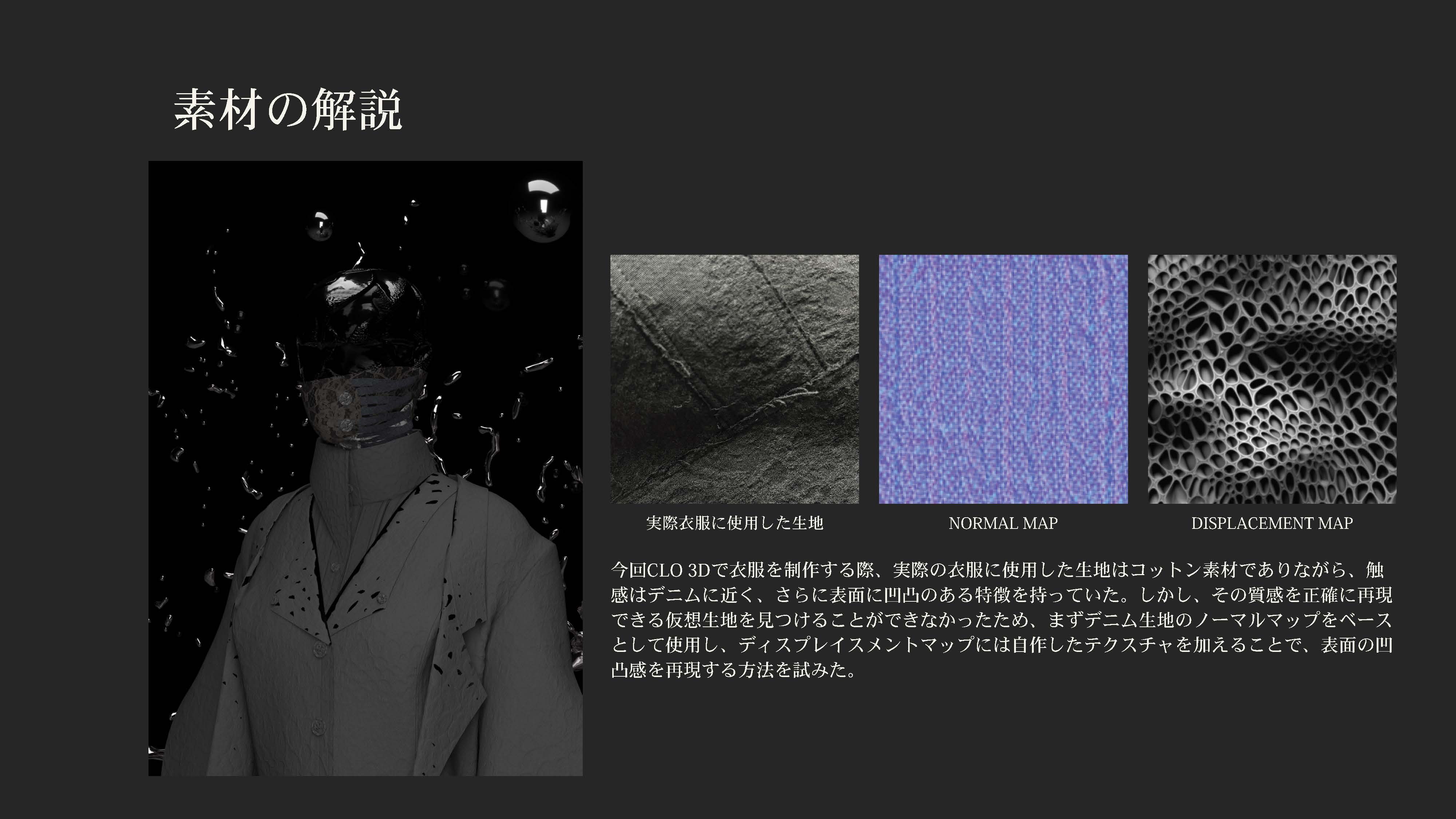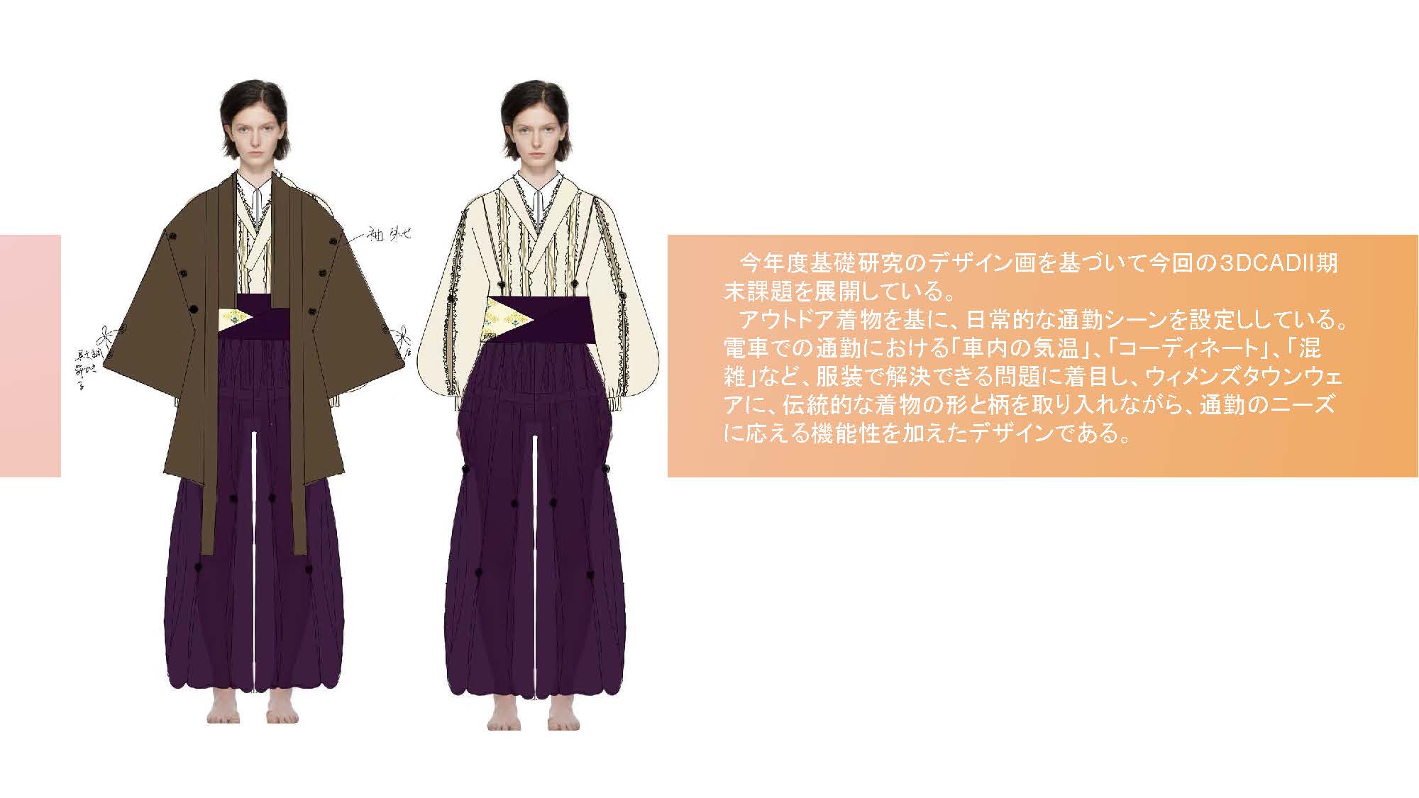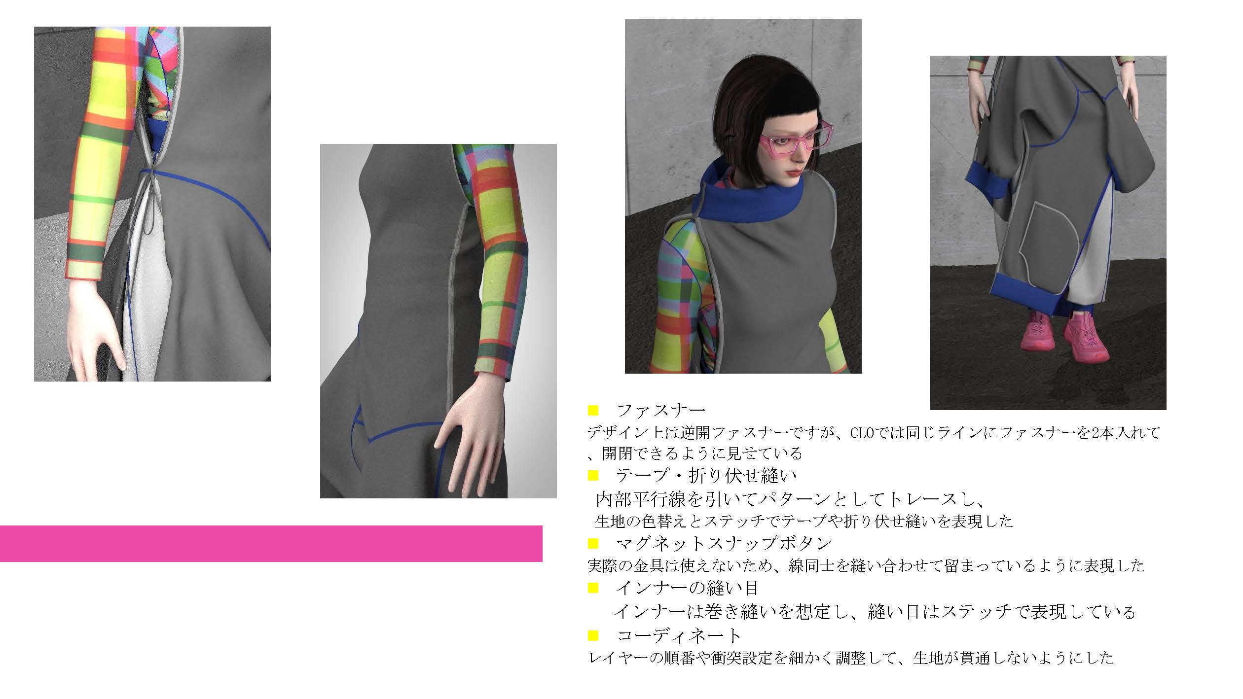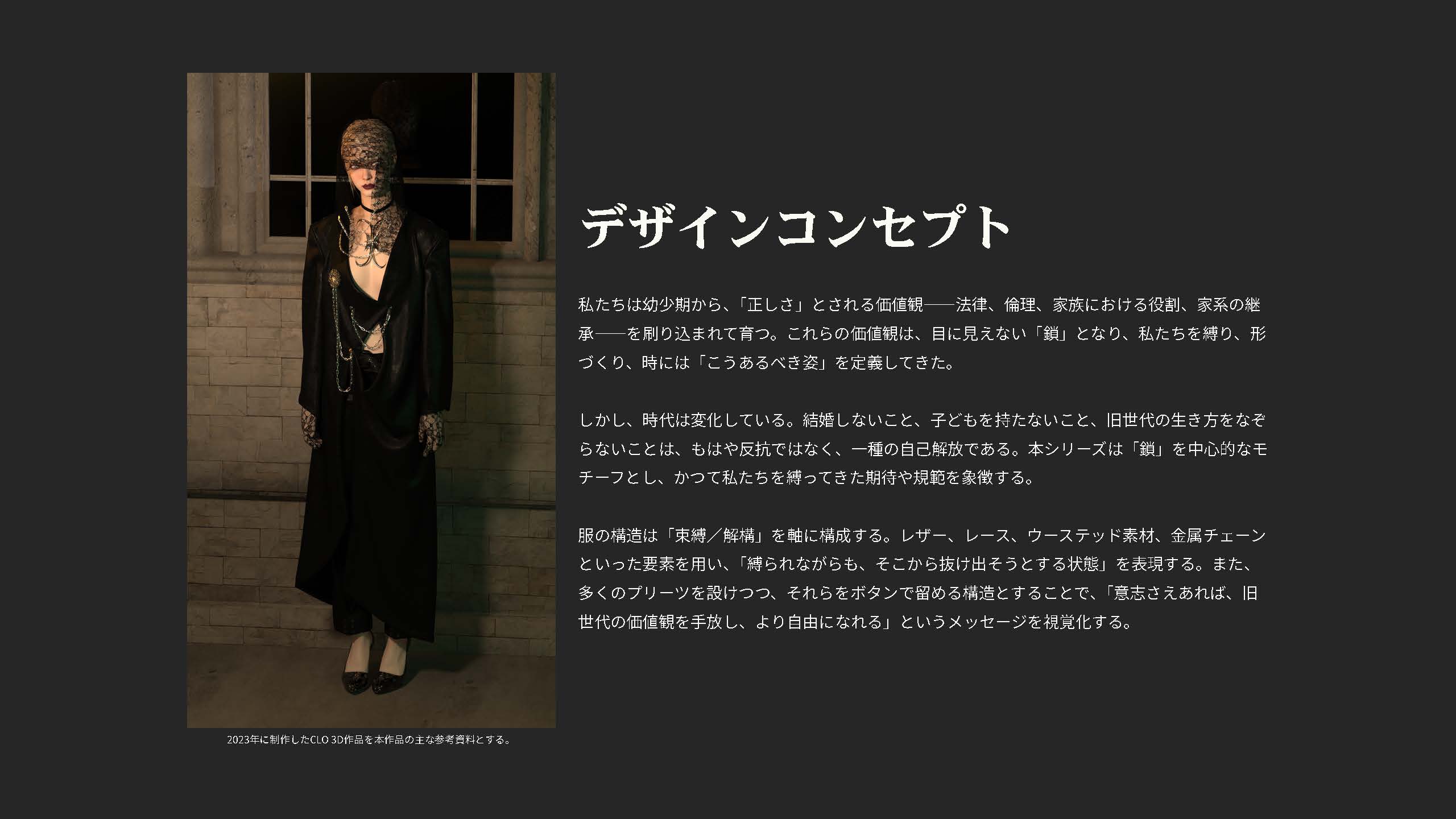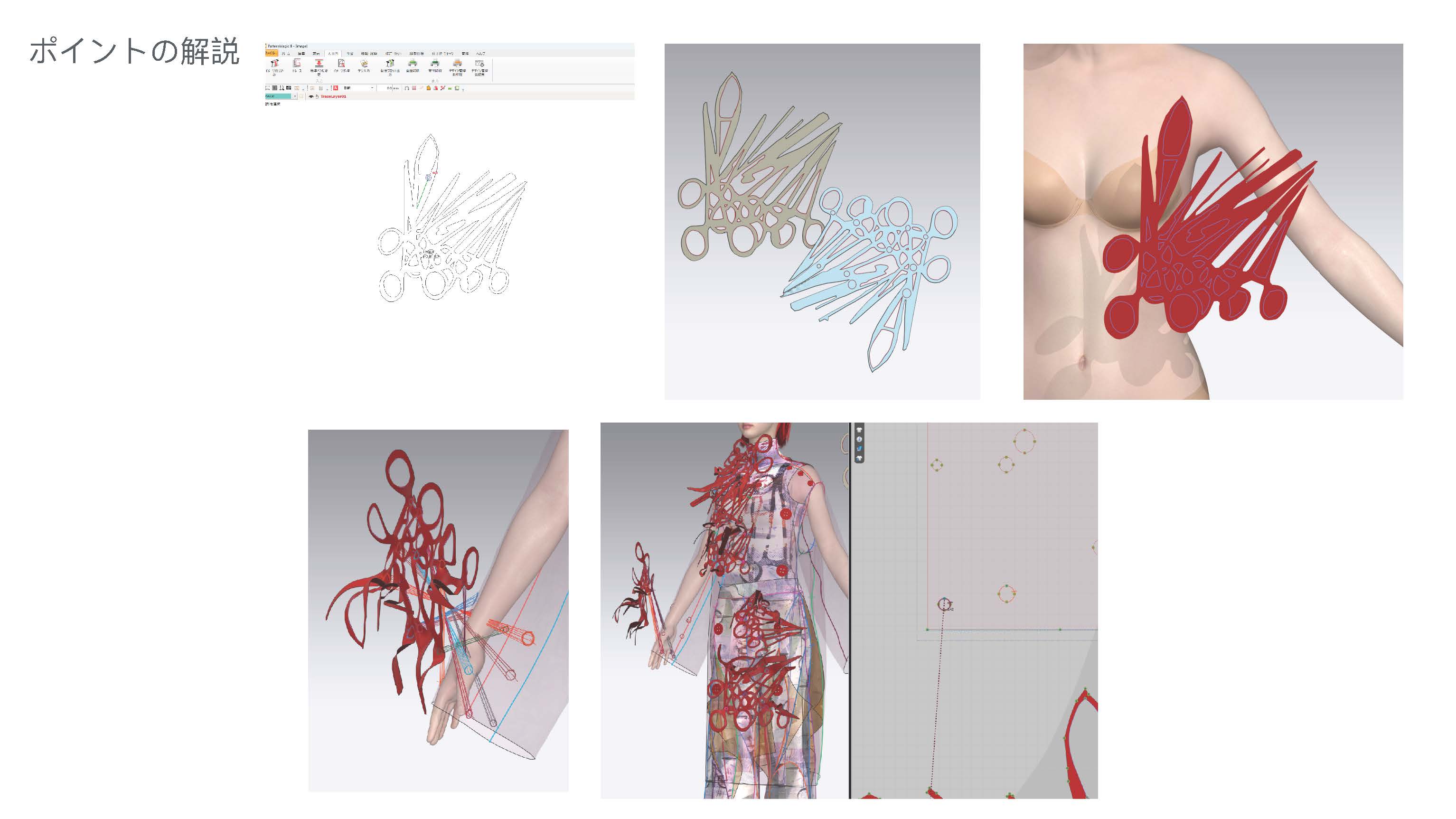 院生の研究や作品制作に アパレル3DCAD「CLO Enterprise」を活用する取り組みを積極的に行っています。 2020年度より、CLO Enterpriseの基礎オペレーションを学ぶ「アパレル3DCADⅠ」と、応用オペレーションを学ぶ「アパレル3DCADⅡ」を開講し、アパレル企業へ3Dデザイナー、3Dモデリストを輩出しております。ファッションクリエイション専攻の受講生の中より選抜された院生の作品を紹介いたします。