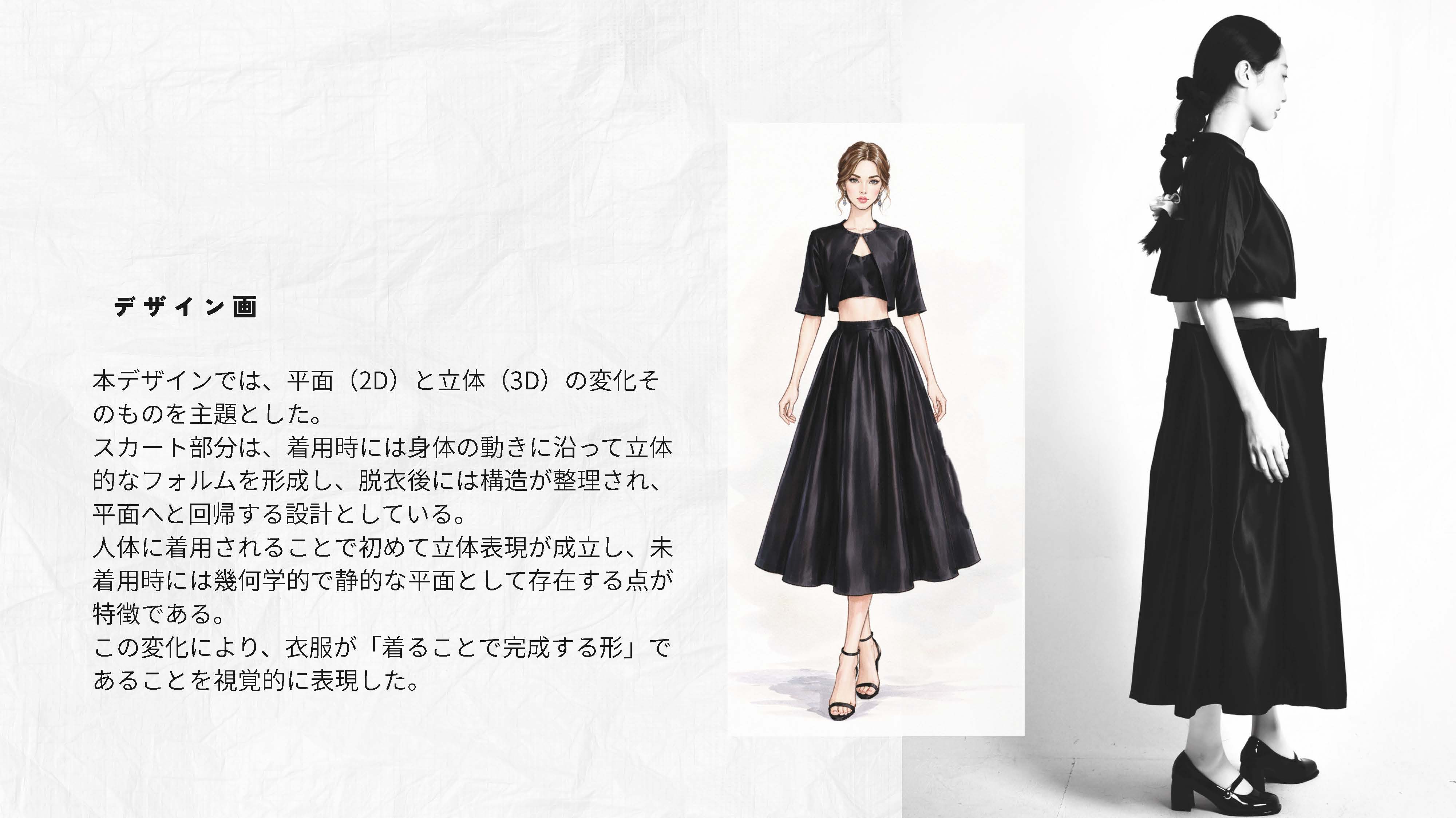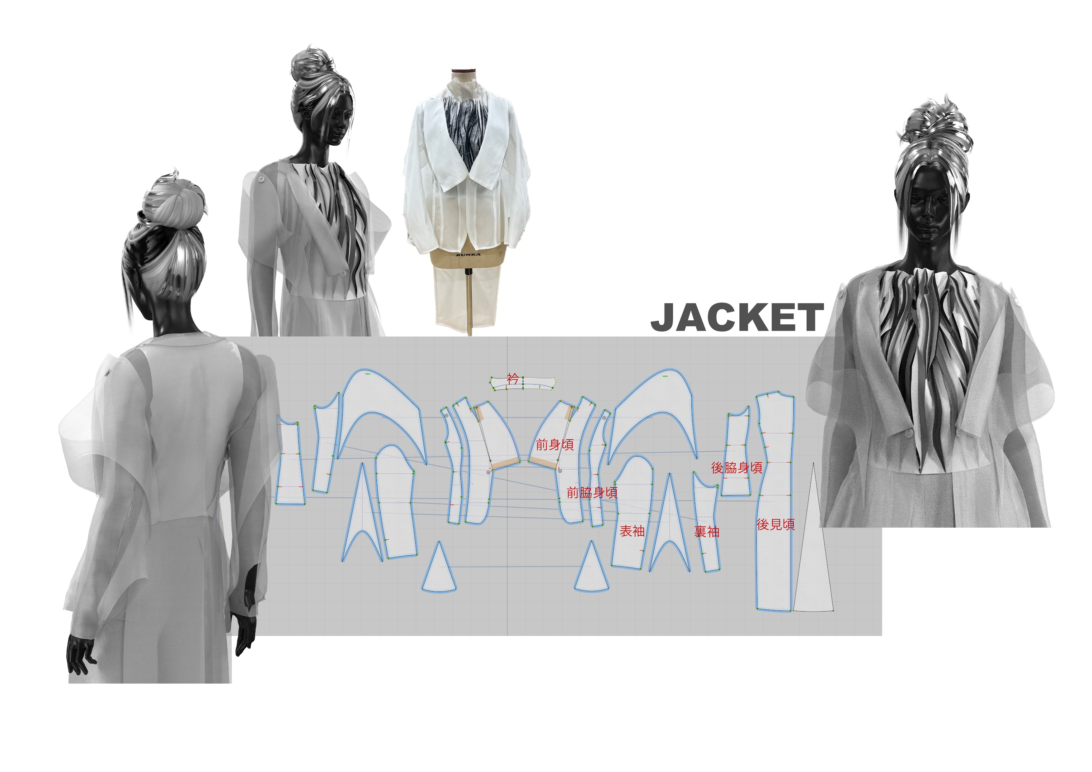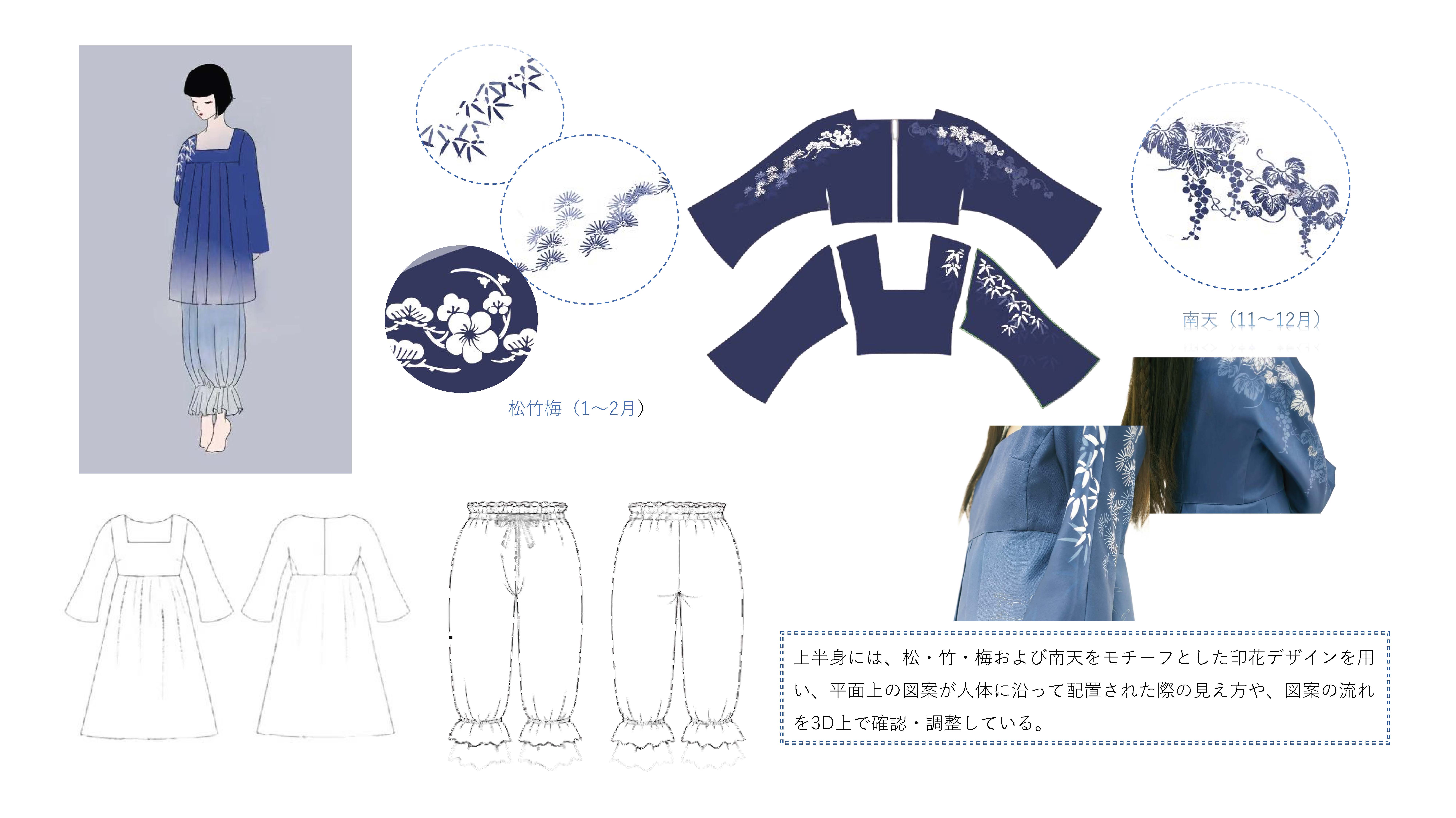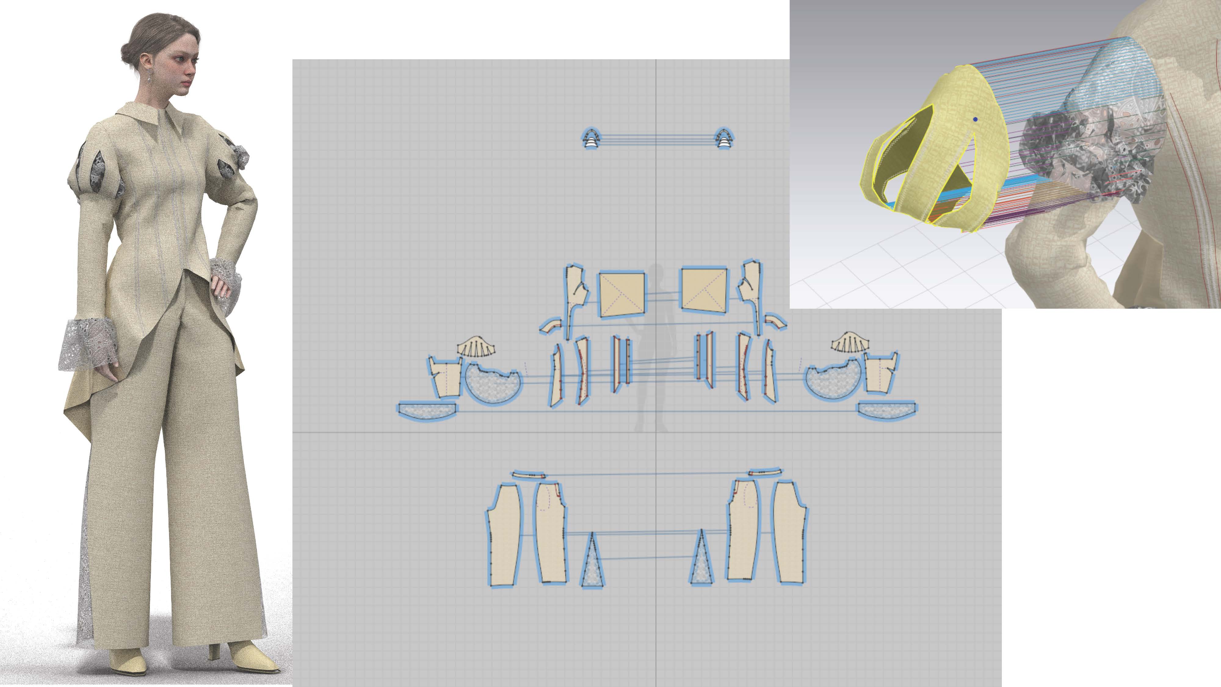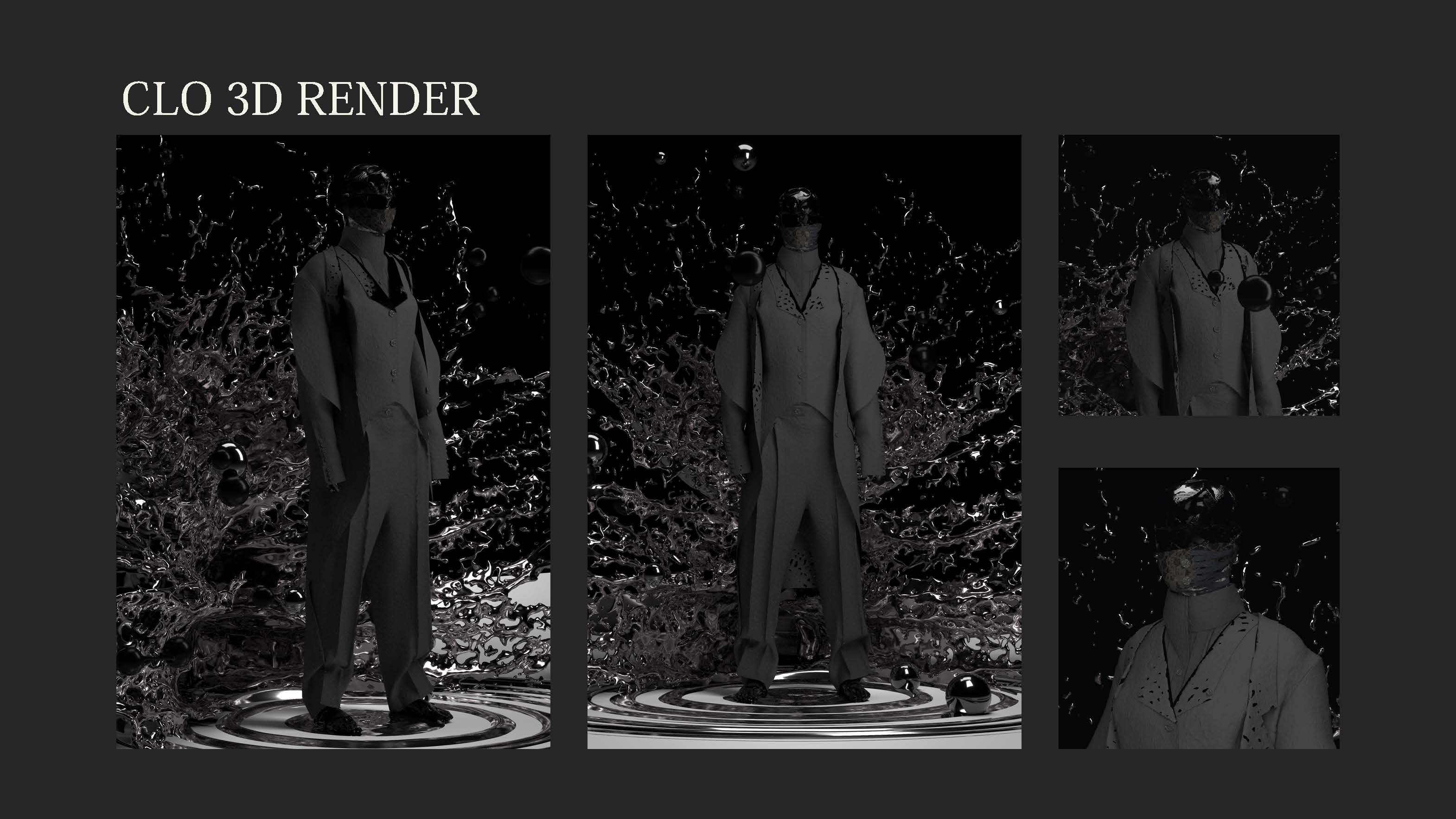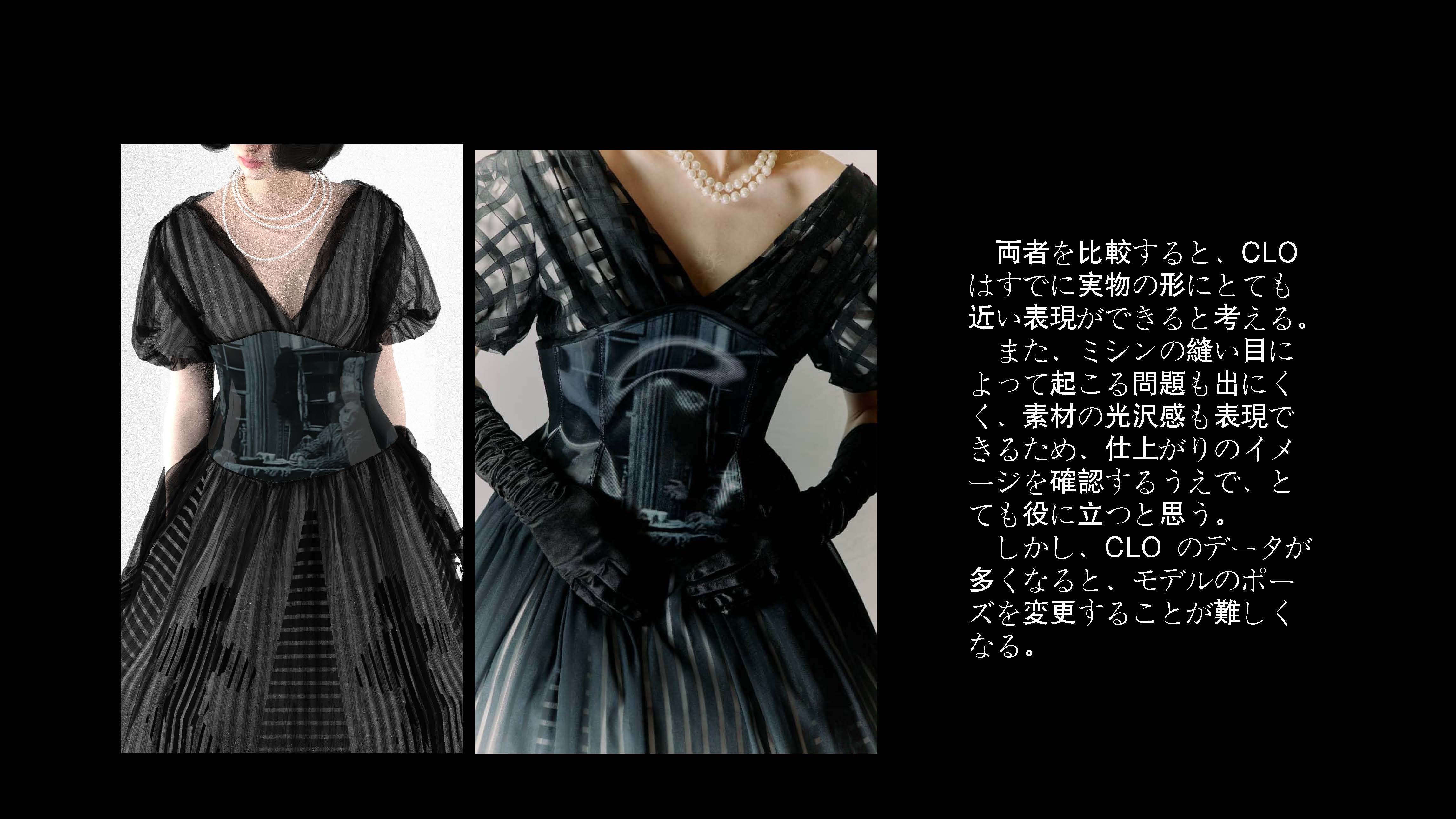 院生の研究や作品制作に アパレル3DCAD「CLO Enterprise」を活用する取り組みを積極的に行っています。 2020年度より、CLO Enterpriseの基礎オペレーションを学ぶ「アパレル3DCADⅠ」と、応用オペレーションを学ぶ「アパレル3DCADⅡ」を開講し、アパレル企業へ3Dデザイナー、3Dモデリストを輩出しております。ファッションクリエイション専攻の受講生の中より選抜された院生の作品を紹介いたします。