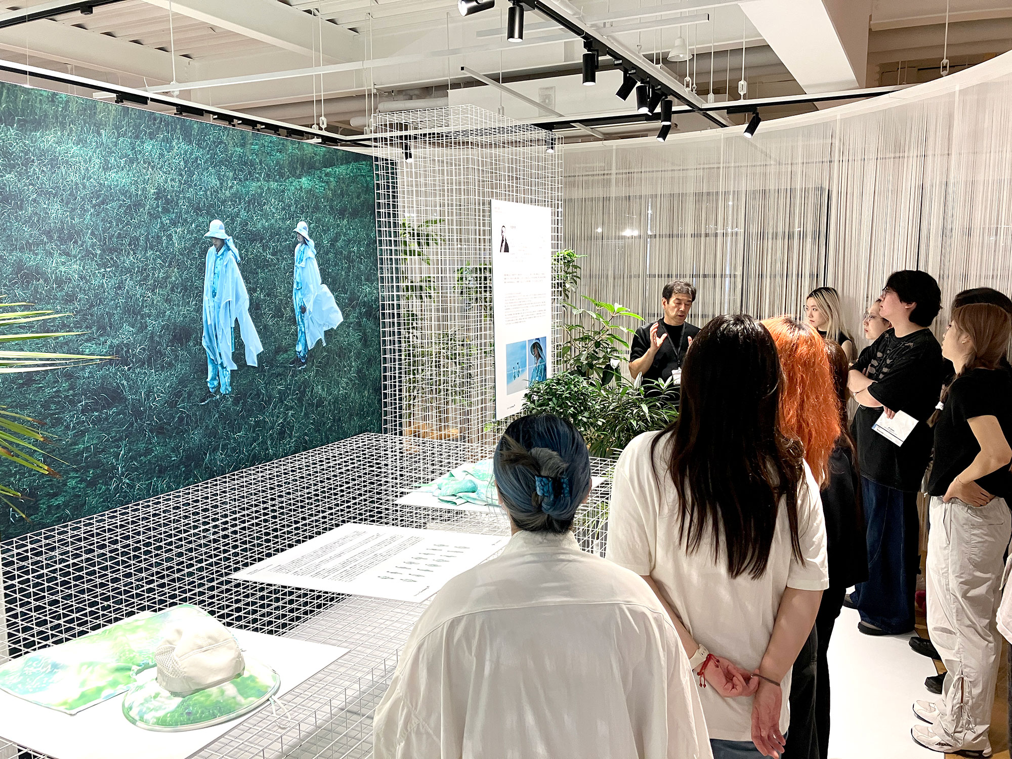 株式会社ゴールドウインがデザイナー中里唯馬氏とコラボレーションして制作した大阪万博のユニフォームについて説明を受ける院生