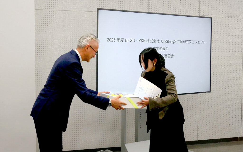 完成した作品は、2025年12月25日(木)に実施した共同研究プロジェクト成果発表会でYKK株式会社の方々による審査を受け、ゴウ エツさんの作品『No Bag, More You』に、「BFGU×YKK株式会社 AiryString® 共同研究プロジェクト YKK賞」が授与されました。