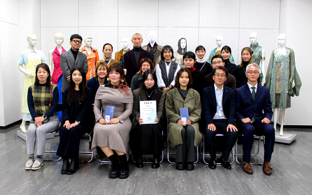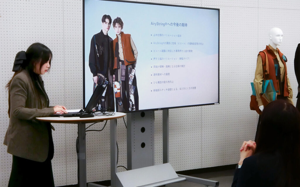 ファッションテクノロジーコースでは、「BFGU×YKK株式会社 AiryString® 共同研究プロジェクト」を実施し、2年次生のゴウ エツさん、キョウ シクンさん、キョウ キンコウさんの3名が参加しました。本プロジェクトは今年度で5回目を迎え、YKK株式会社のファスナー AiryString® を使用し、新たな活用方法や課題解決に向けた研究を行いながら、作品制作に取り組みました。